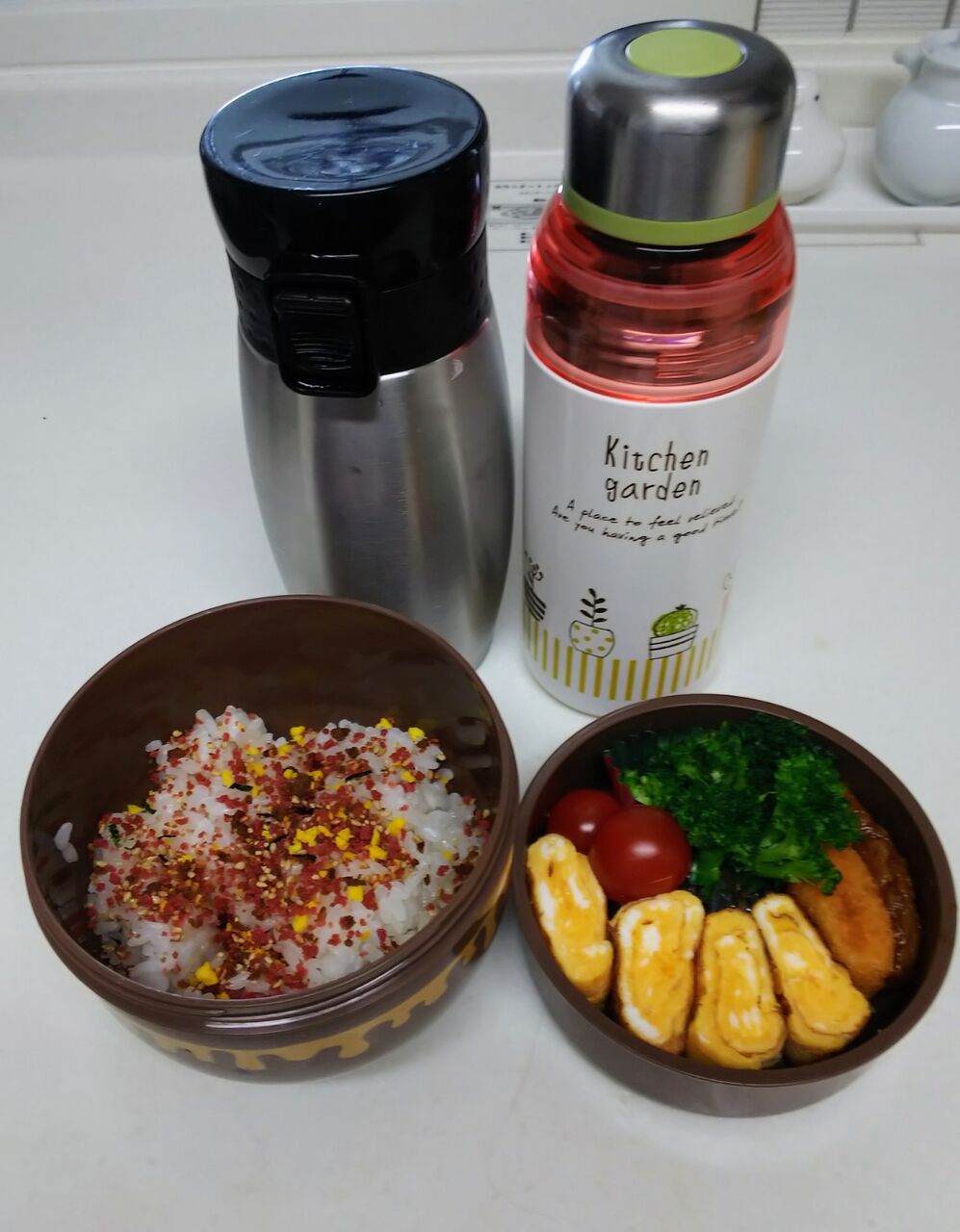 銀色の水筒はコーヒー、白色の水筒はルイボスティーが最近の定番でした。