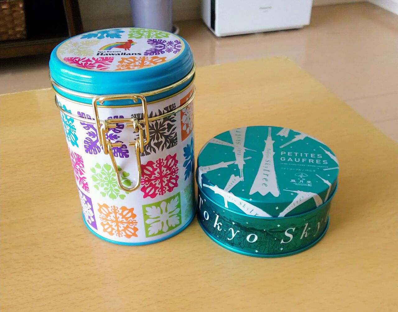 こちらもいつか何かを入れようと取っておいたお菓子の缶。