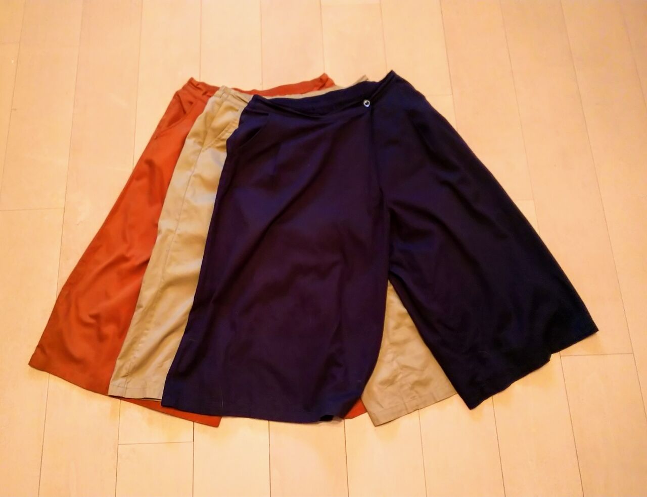フェリシモで買ったガウチョパンツ3色。