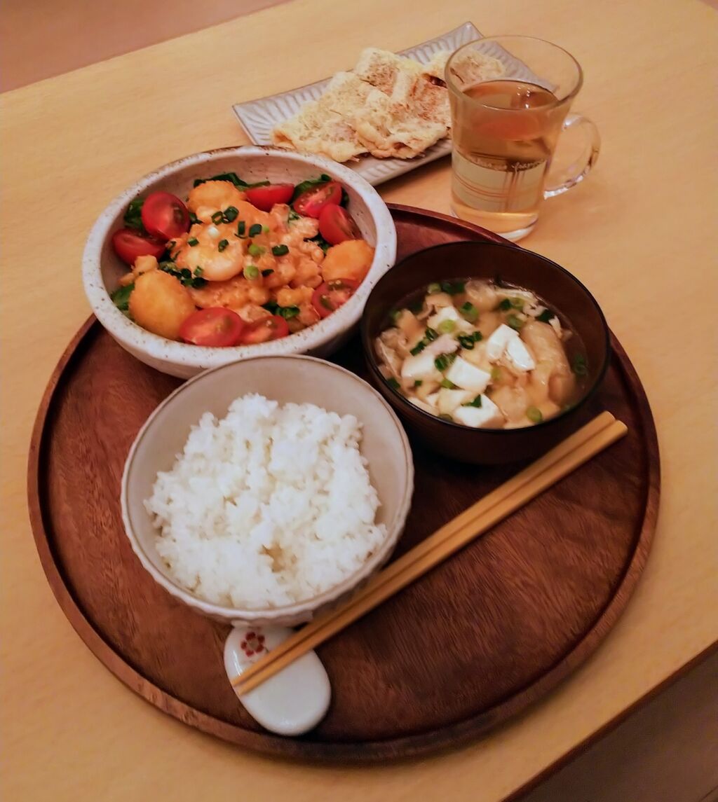 早めにお風呂に入って、夕ごはんは冷凍エビでエビマヨを作りました。