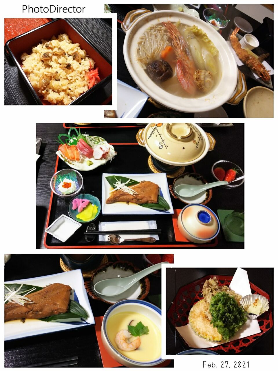 刺身、天ぷら、お鍋、煮魚、エビフライ、茶碗蒸し等々、食べきれないボリュームで、あさりごはん(画像左上)は部屋へ持ち帰って夜中に貪り食べました。