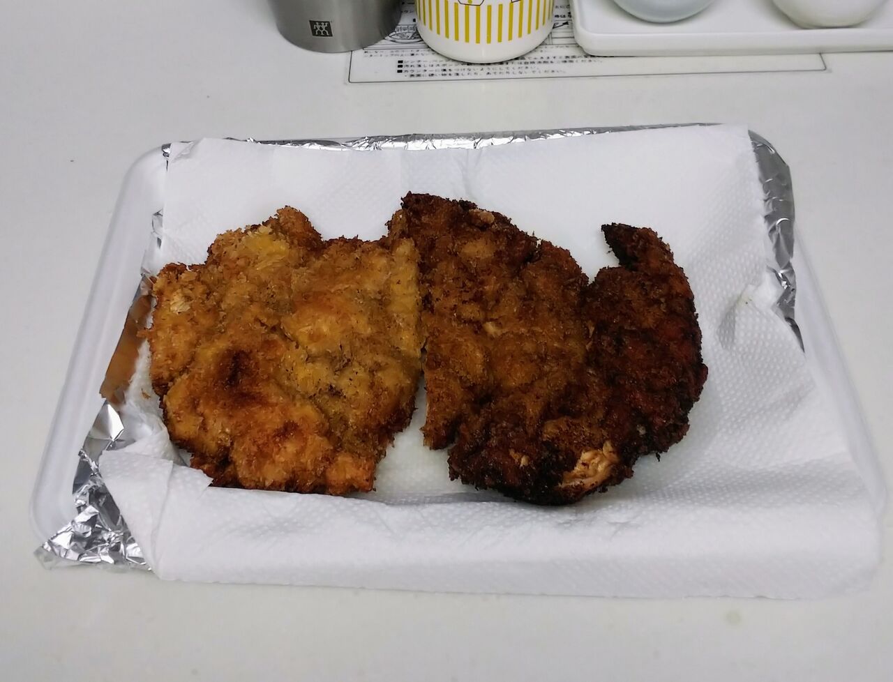 朝からバタバタして何も食べてないと言ったら、母が最近覚えた得意料理「チキンカツ」を揚げて持たせてくれました。