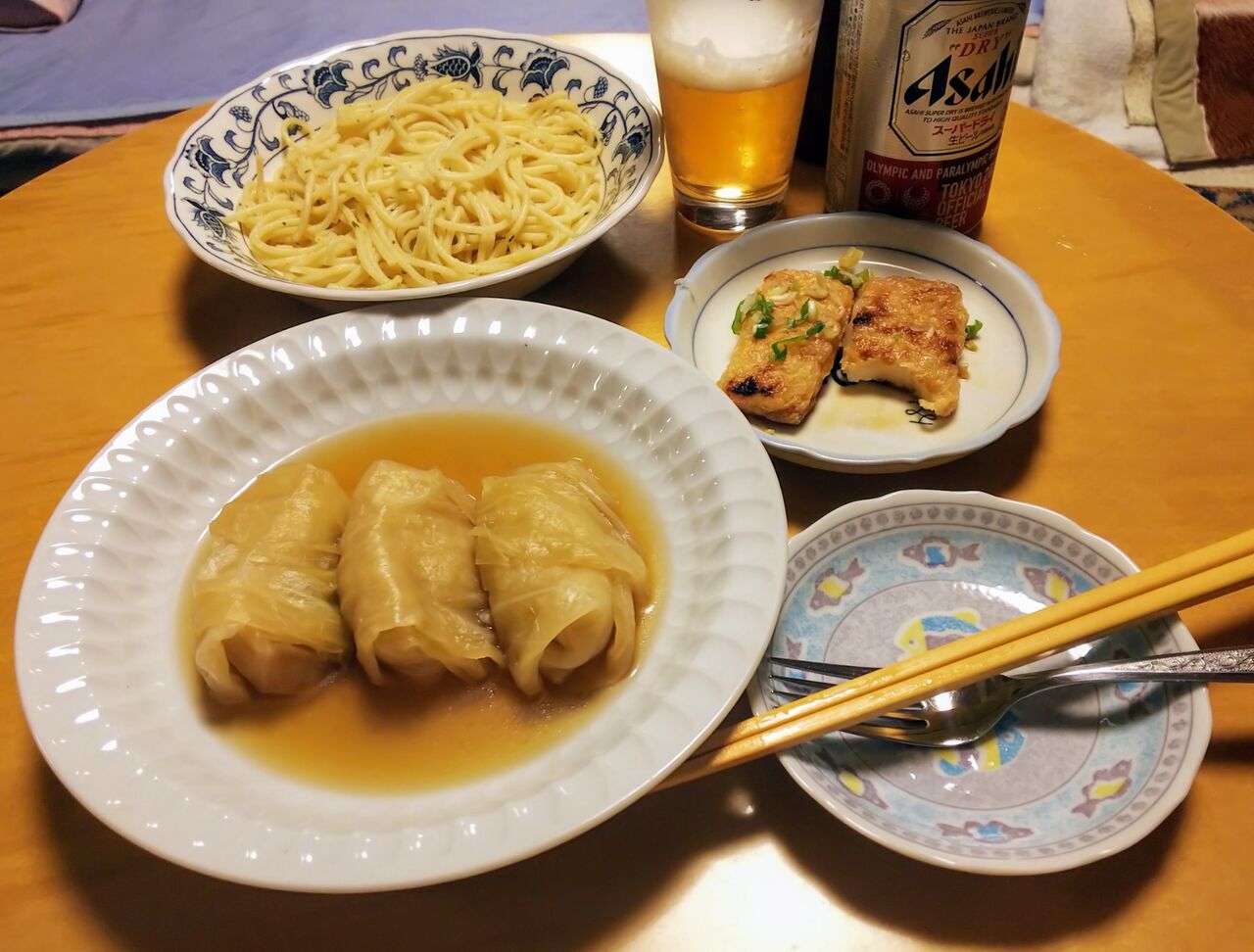 別な日はロールキャベツとペペロンチーノ。