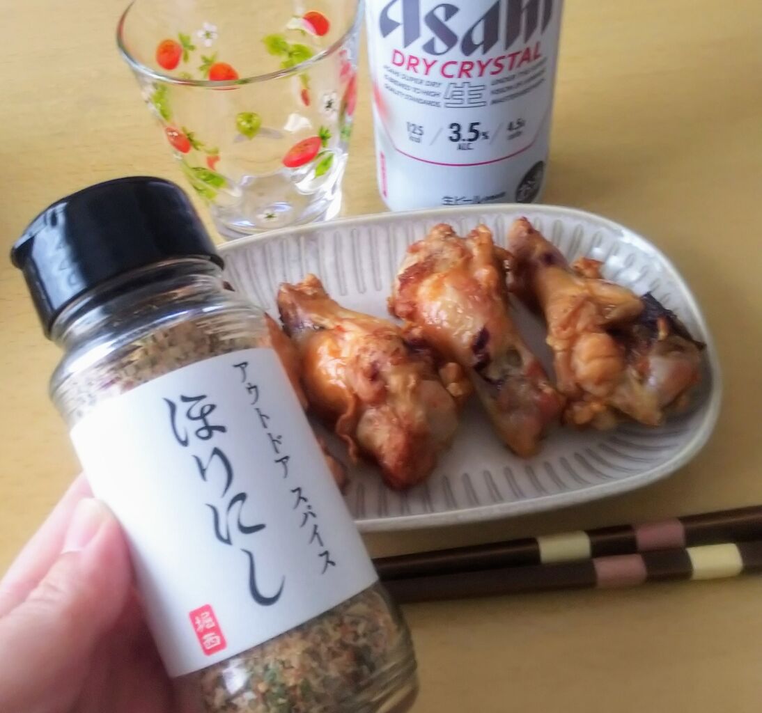 ノンフライヤーでカリっと調理した手羽元に振りかけていただきました。