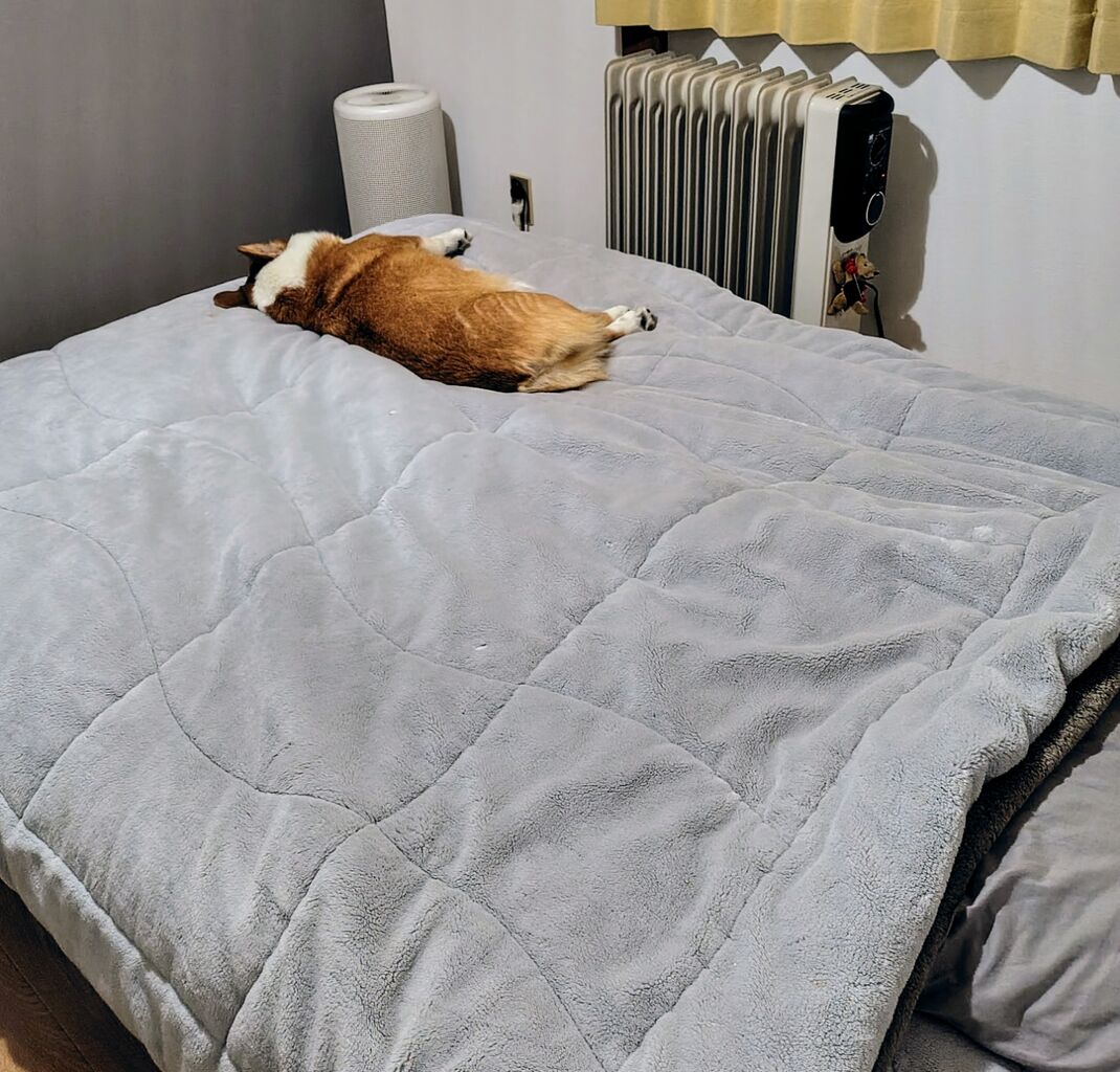 ちゃんと電気敷毛布がある足のあたり、オイルヒーターの近くをキープしています。