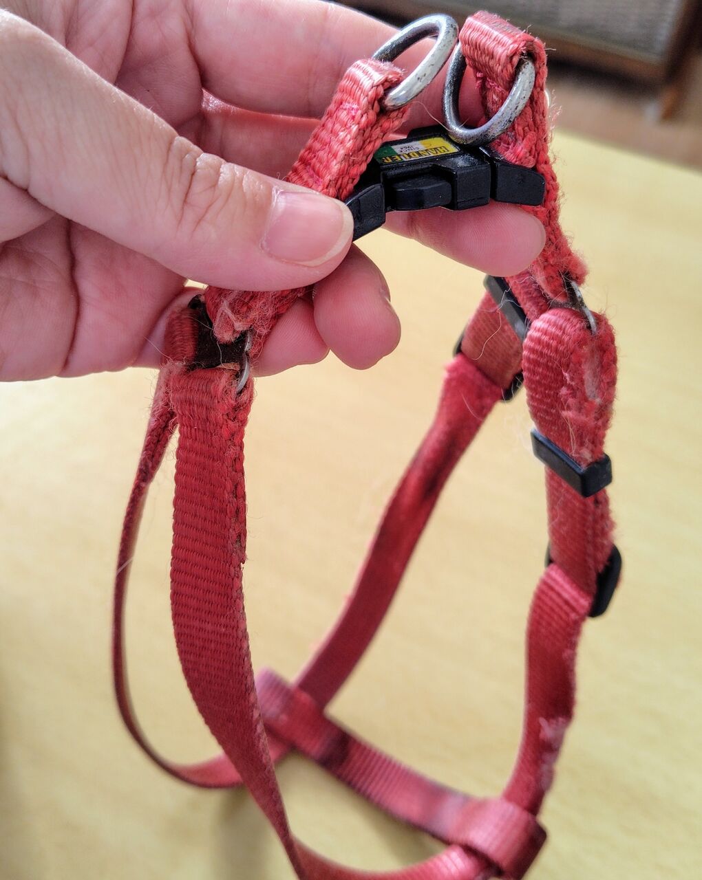犬の使っているハーネスは前の犬が使っていたもののお下がりです。