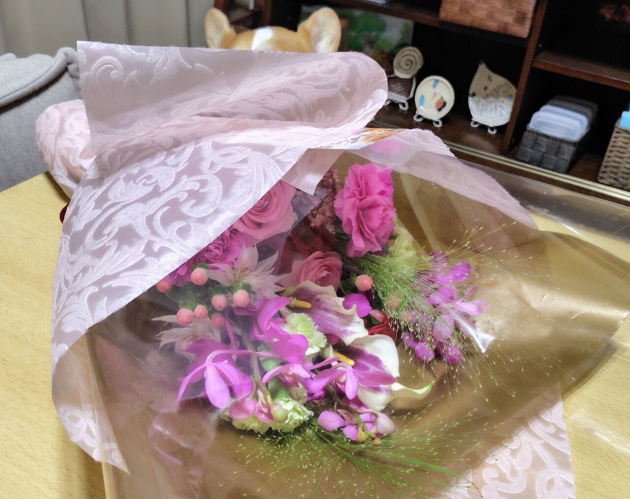 職場でいただいた花束を眺めながら幸せな気分に浸ってます。